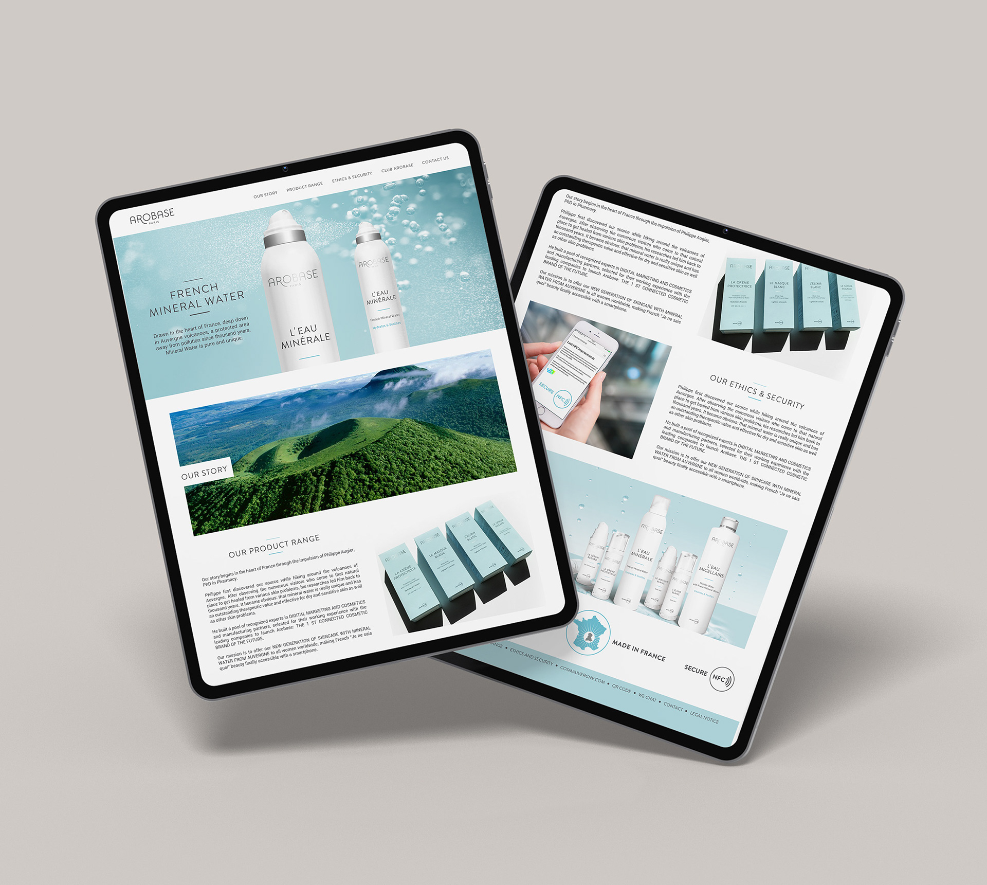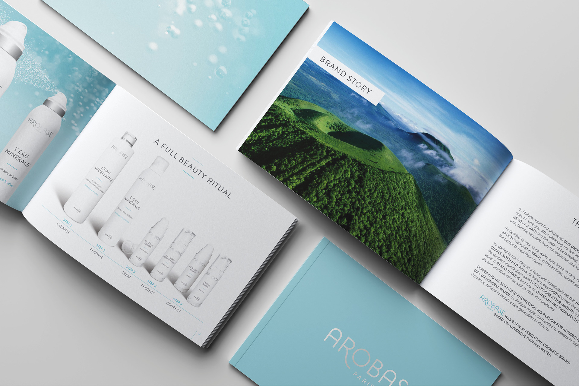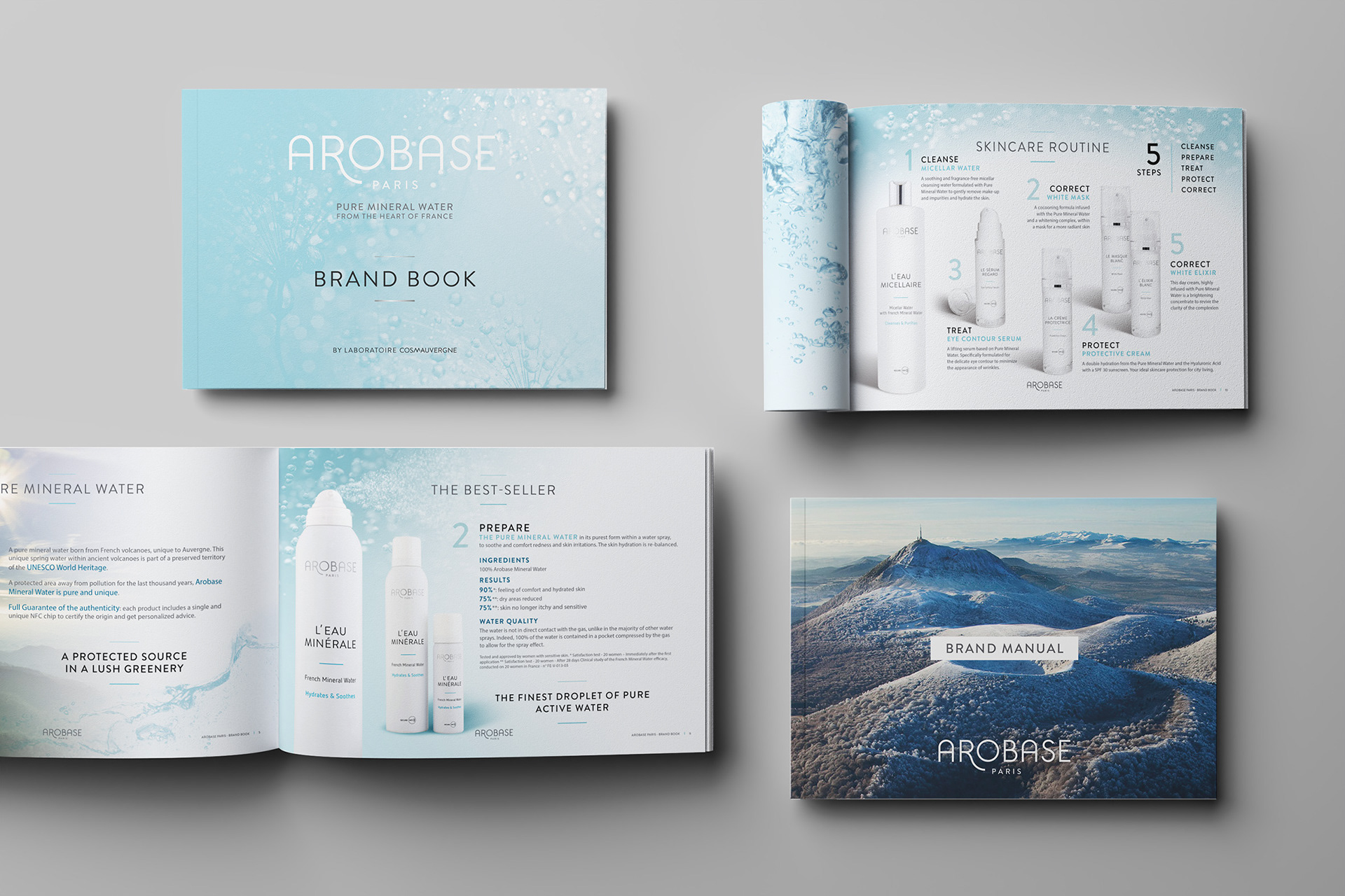 Brand identity, packaging, print and web design for a French cosmetics brand formulated with natural mineral water in Auvergne, creating a cohesive and refined visual universe across all brand touchpoints. Identité de marque, packaging, supports print et design web pour une marque de cosmétiques française formulée à base d’eau minérale naturelle, en Auvergne, créant un univers visuel cohérent et raffiné sur l’ensemble des points de contact de la marque.
