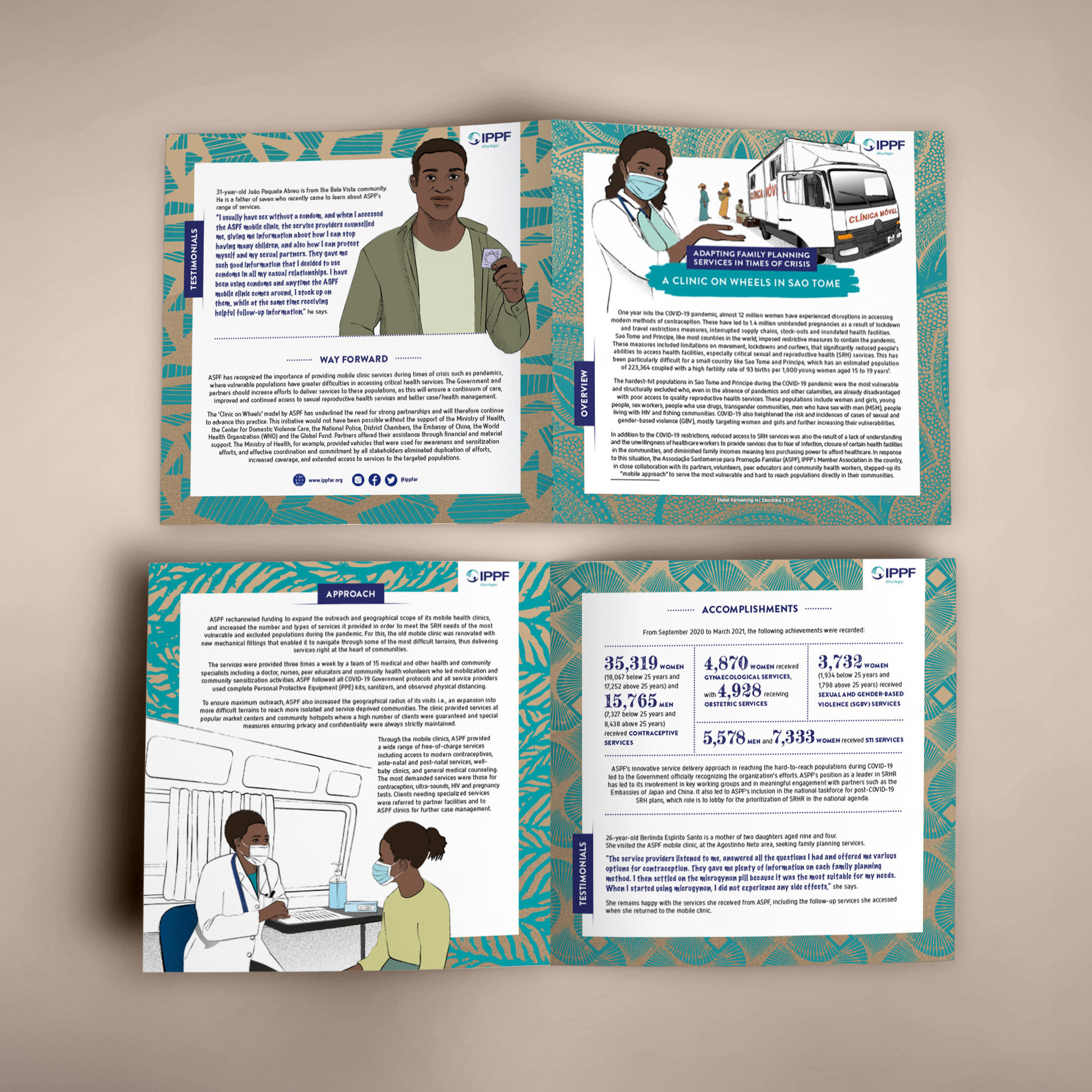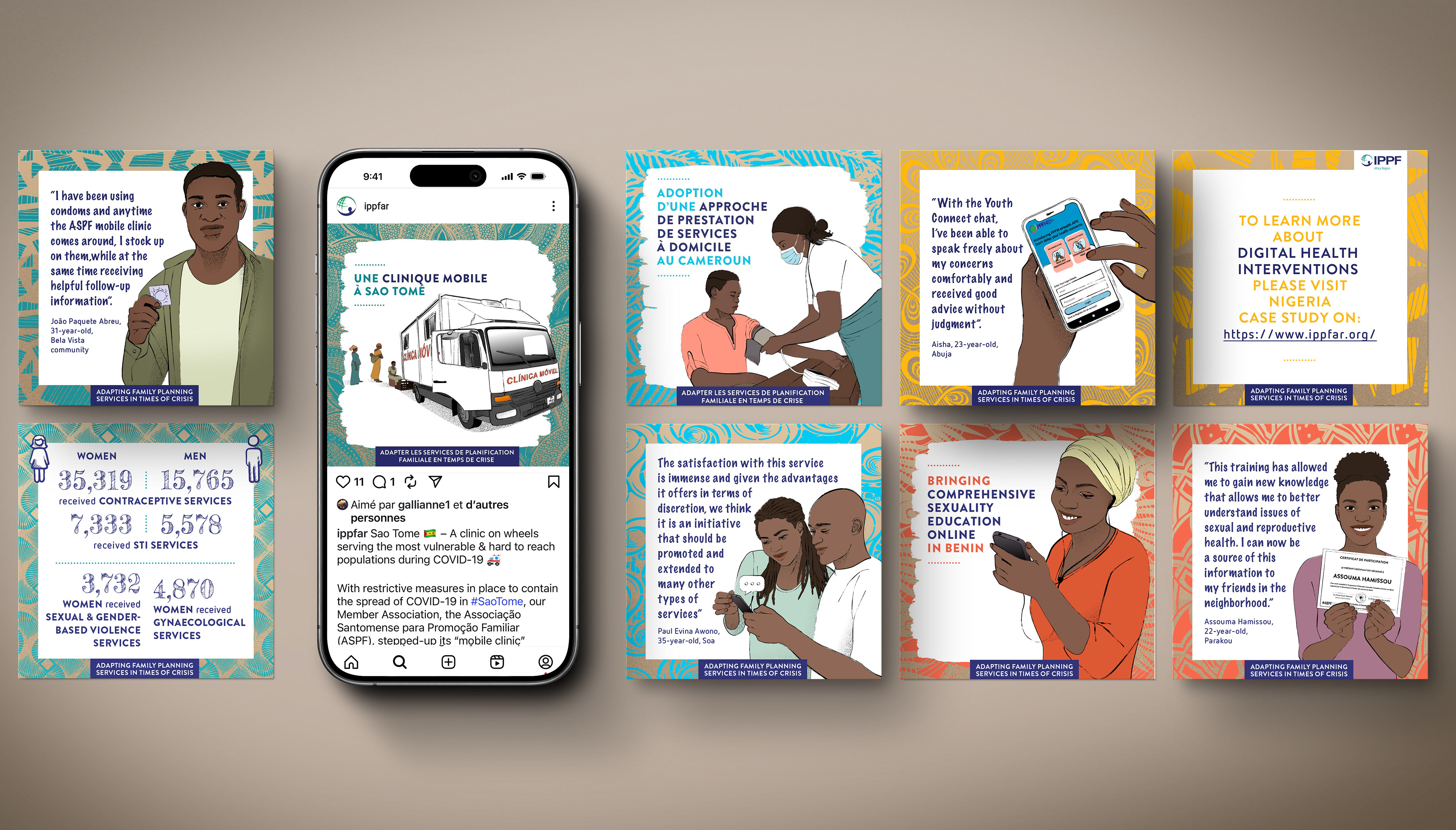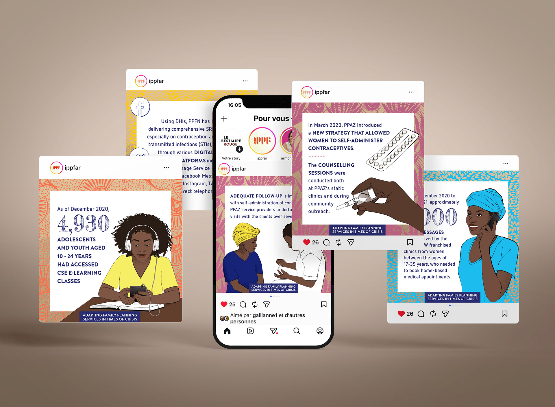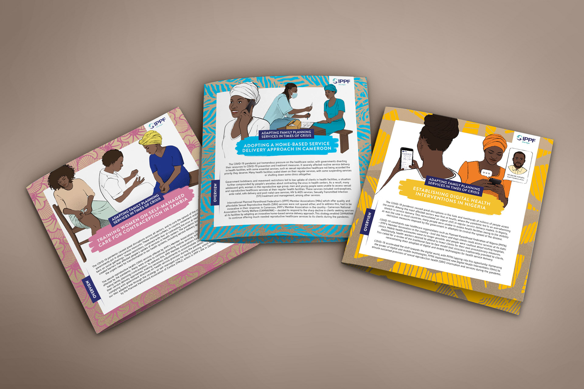 « Adapter les services de planification familiale en temps de crise » — Direction artistique, conception graphique et illustration de cinq études de cas pays, déclinées en brochures imprimées et adaptées en campagne Instagram. “Adapting Family Planning Services in Times of Crisis” — Creative direction, design and illustration of five country case studies, developed as printed brochures and translated into an Instagram campaign.